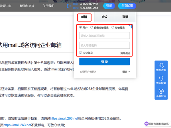 2、可以通过263企业邮箱官方登录地址“mail.263.net”选择用户或者管理员身份登录